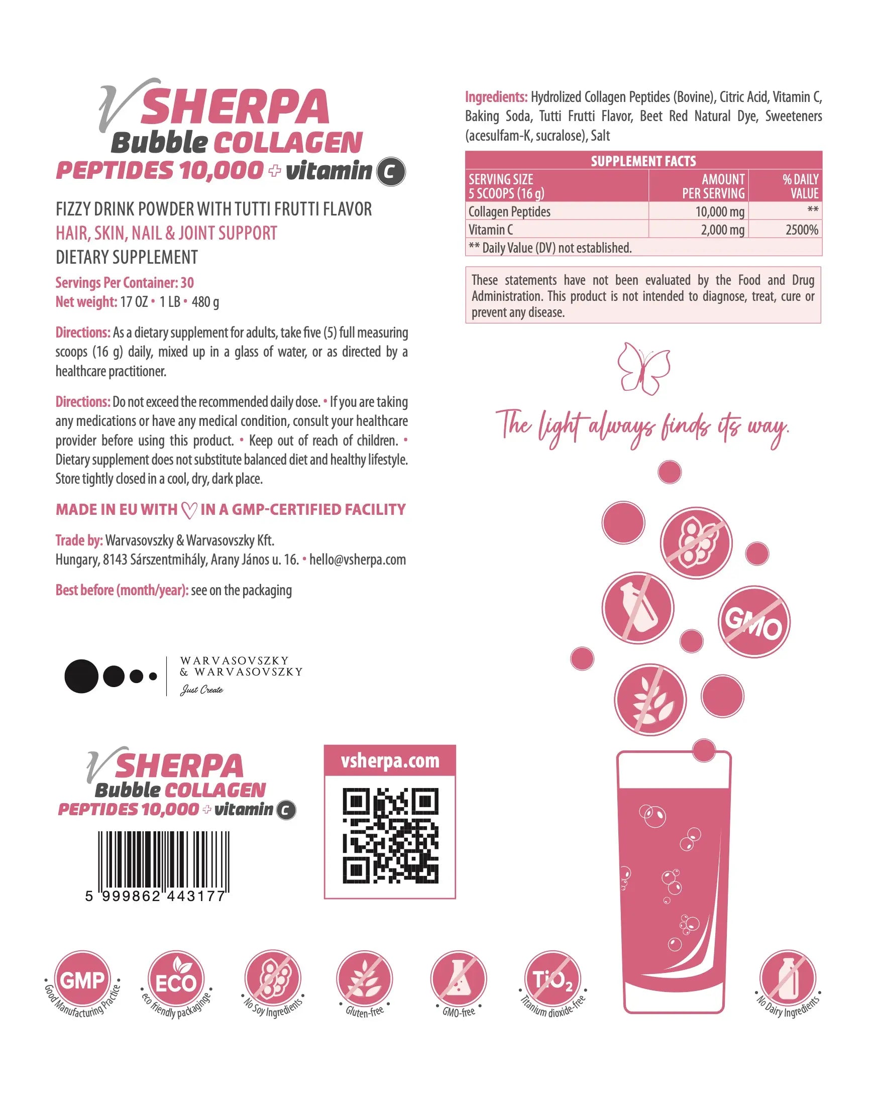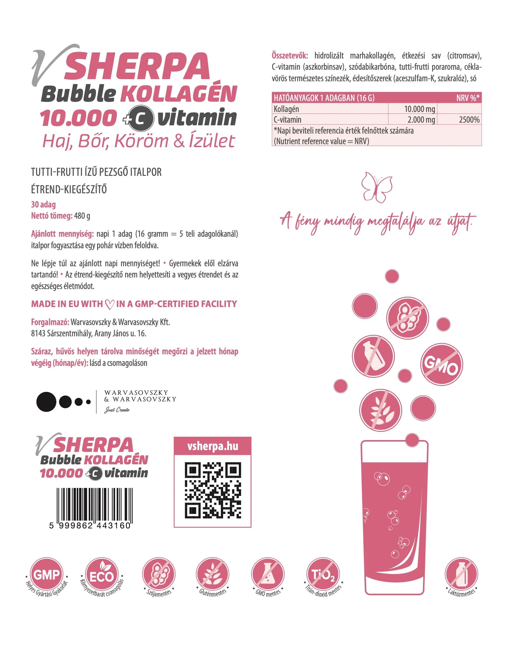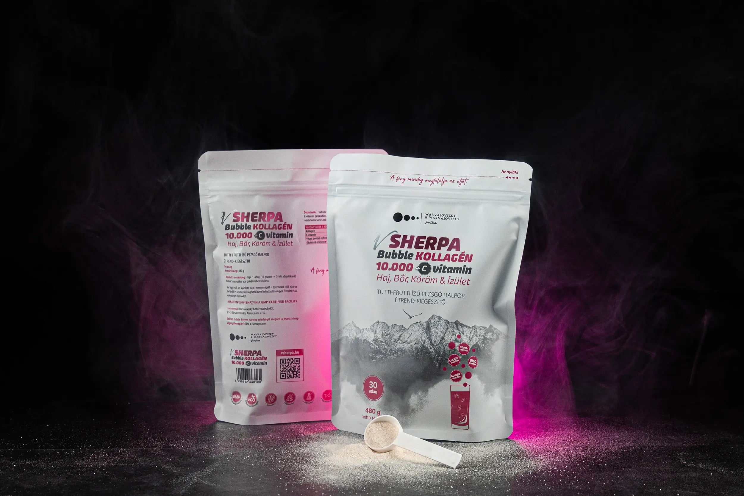 Csatlakozz hozzánk a vSherpa közösségben, és tedd az egészséged és szépséged a középpontba! Az vSherpa Bubble Kollagén + C-vitamin pezsgő italpor segít abban, hogy könnyedén és ízletesen vihesd be a szervezetedbe a napi 10 g kollagént és 2 g C-vitamint. Tegyél egy lépést az egészségesebb élet felé, és élvezd a vSherpa minőségét minden kortyban!
