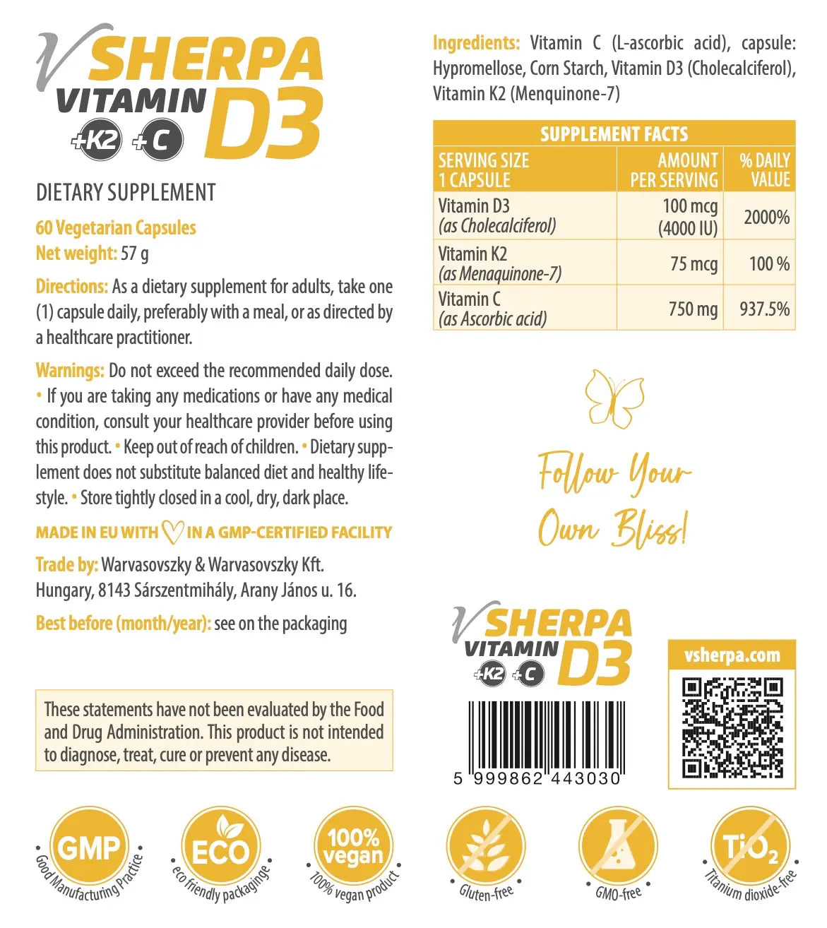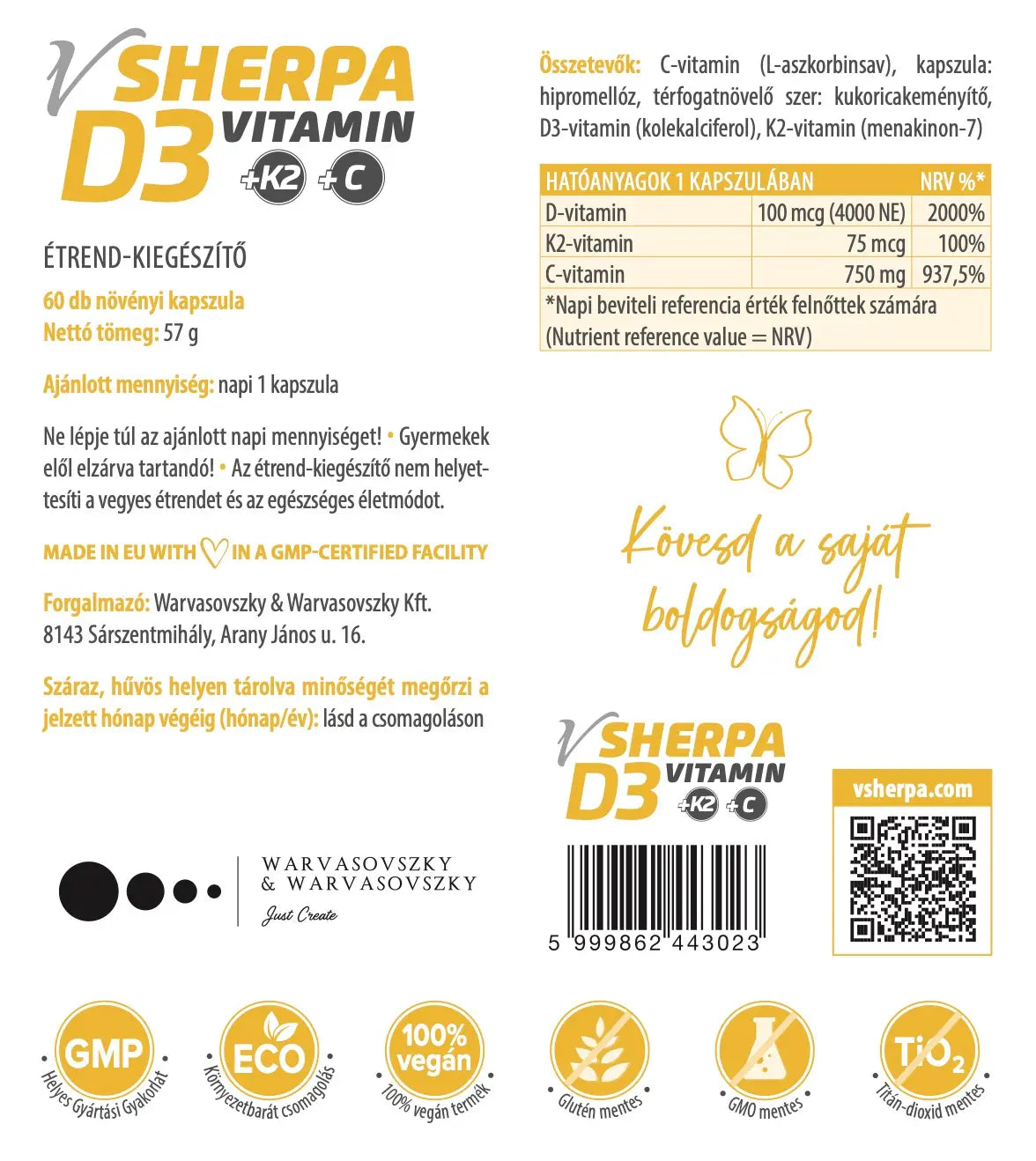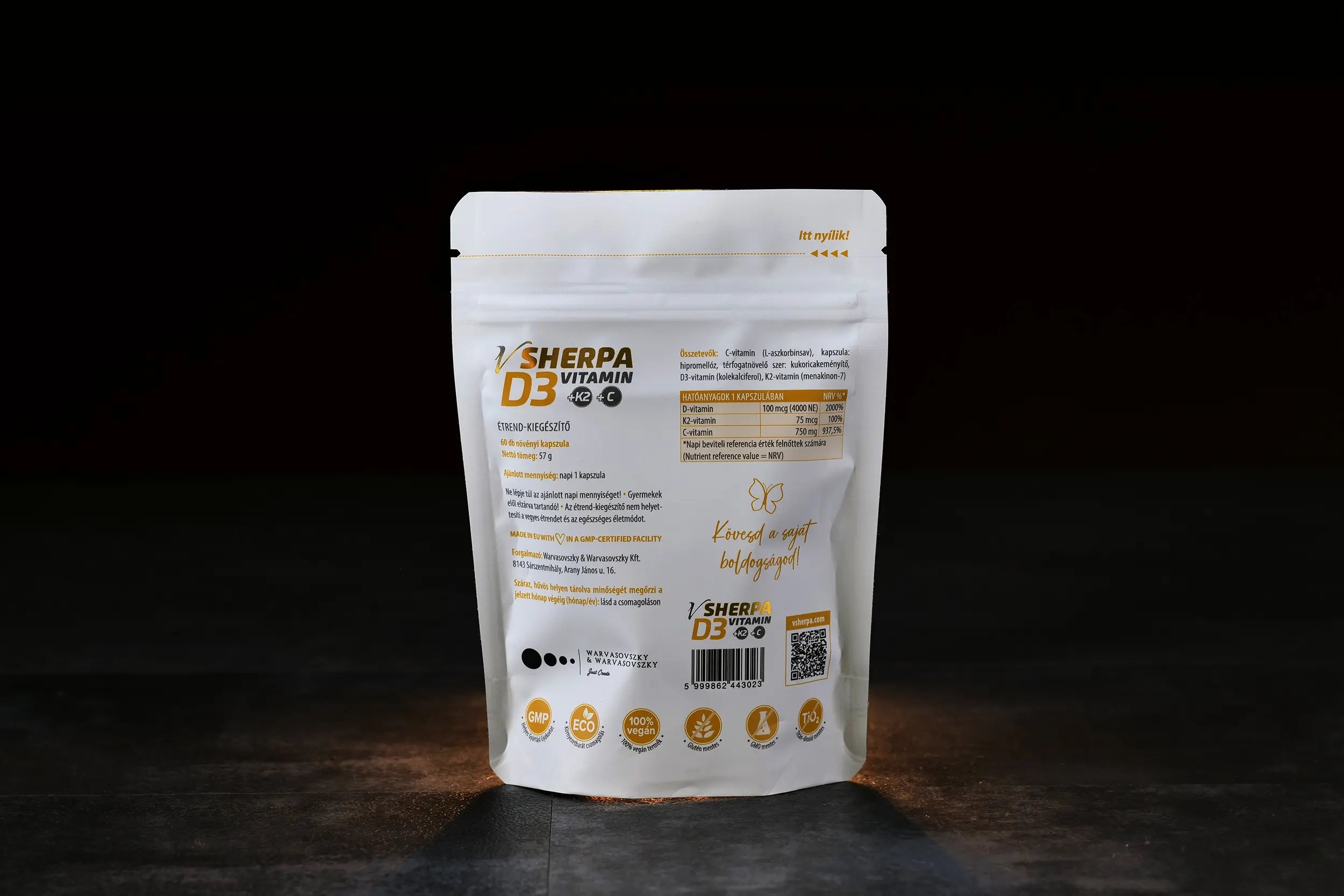 A vSherpa D3-vitamin + K2-vitamin + C-vitamin étrend-kiegészítő készítmény tasakonként 60 db vegán kapszulát tartalmaz.