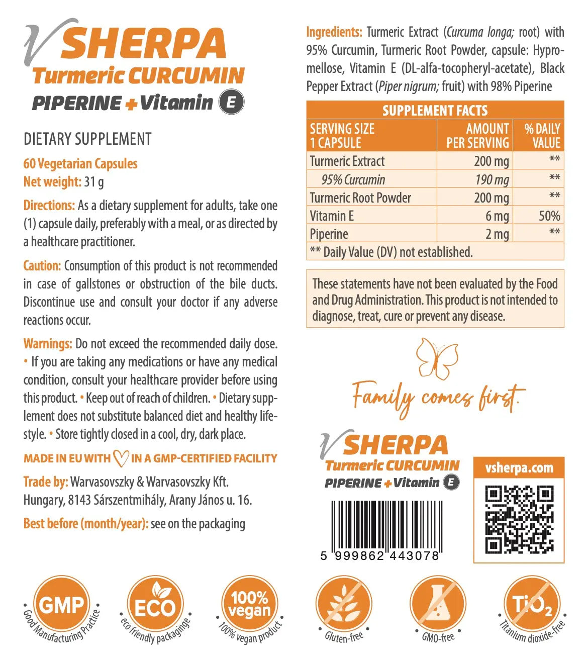 A vSherpa Kurkuma + Piperin + E-vitamin étrend-kiegészítő magyarországi GMP auditált üzemben készül. GMP: Good Manufacturing Practice, azaz Helyes Gyártási Gyakorlat. Alkalmazása a gyógyszeriparban terjedt el. A termékbiztonság és az egyenletes termékminőség érdekében alkalmazható módszerek általános gyűjteménye. Két fő eleme a hatékony gyártási műveletek és a hatékony ellenőrzés. A GMP követelményei a gyártáson kívül a minőségellenőrzésre is vonatkoznak. A gyártási és ellenőrzési adatokat dokumentálni kell és az adatokat meg kell őrizni, így azok visszakereshetőek.