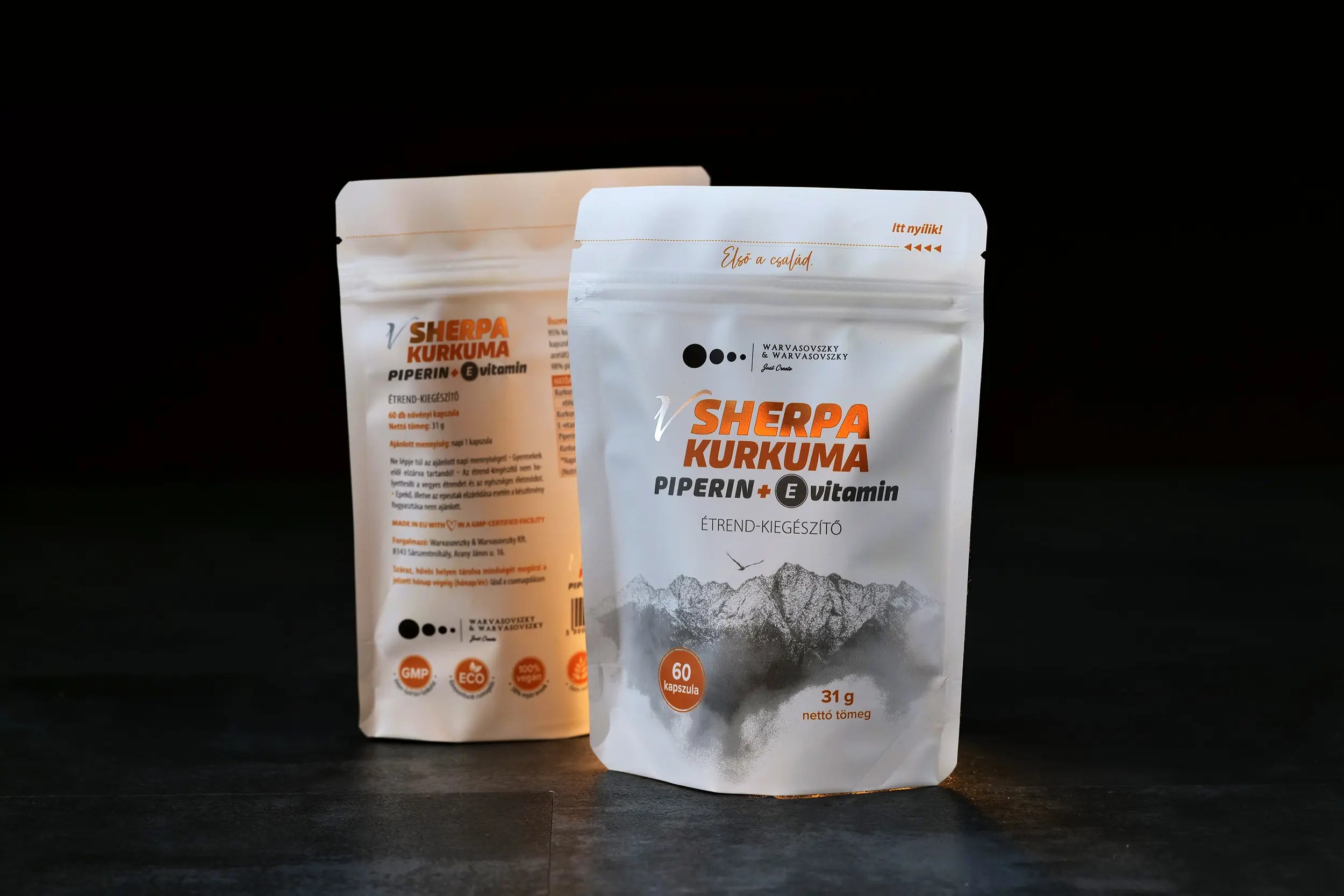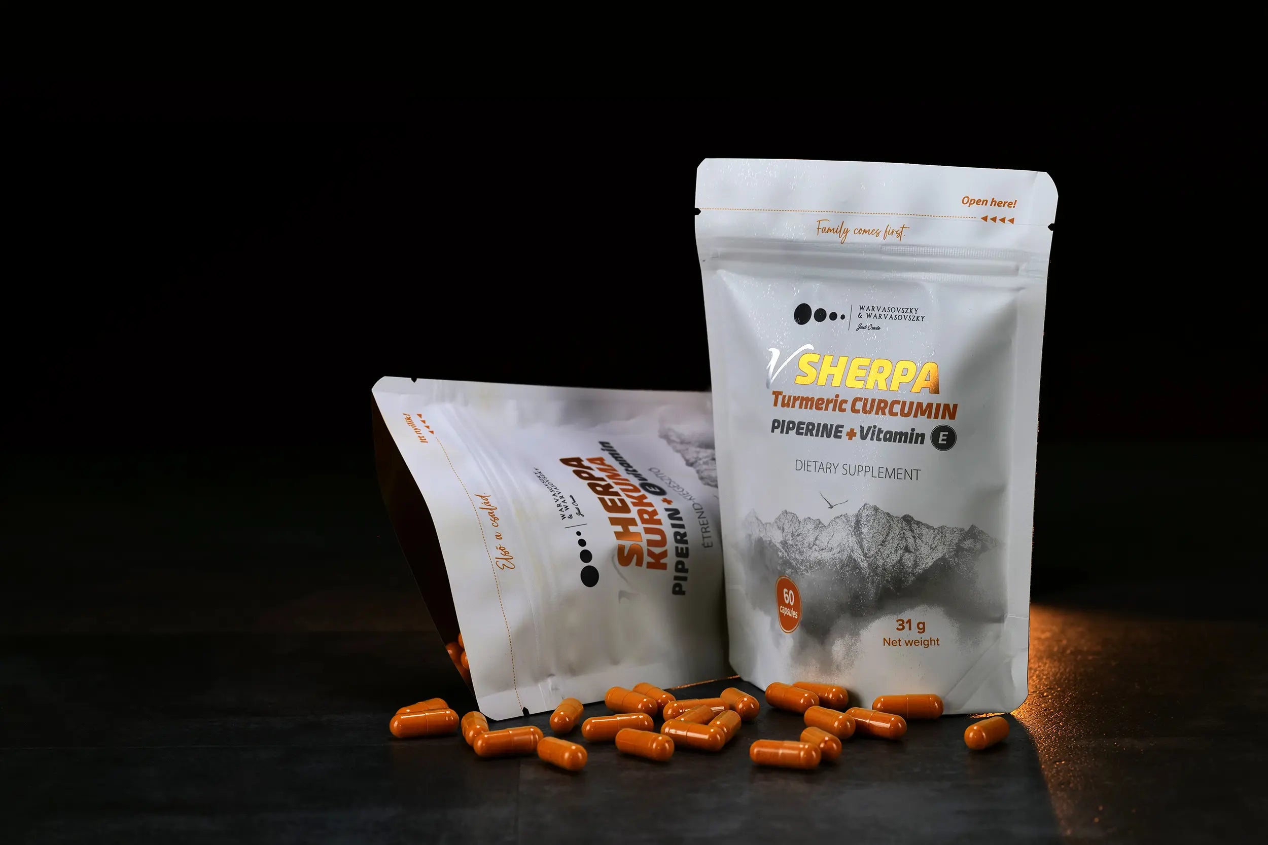 A vSherpa Kurkuma + Piperin + E-vitamin étrend-kiegészítő készítmény tasakonként 60 db vegán kapszulát tartalmaz.