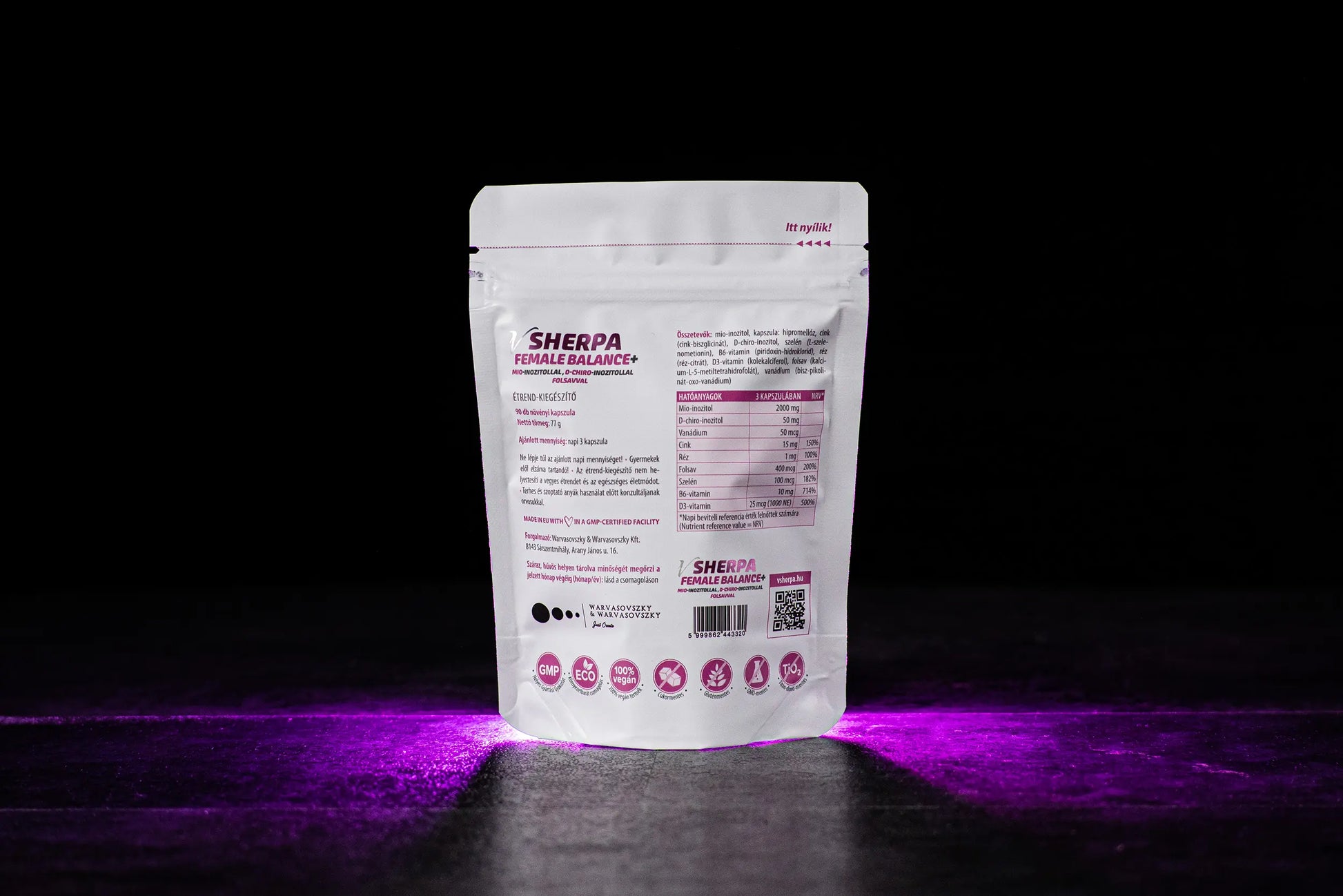 A vSherpa Female Balance+ egy célzottan nők számára fejlesztett prémium étrend-kiegészítő, komplex formula, amely kifejezetten a nők hormonális egyensúlyának, egészséges anyagcseréjének és termékenységének támogatására készült. A készítmény középpontjában a tudományosan meghatározott, ideális 40:1 arányú mio-inozitol (2000 mg) és D-chiro-inozitol (50 mg) kombinációja áll. Ez az arány és hatóanyag-mennyiség a legújabb klinikai vizsgálatokban a leghatékonyabbnak bizonyult a PCOS (policisztás ovárium szindróma), az inzulinrezisztencia és a hormonális egyensúly támogatásában.